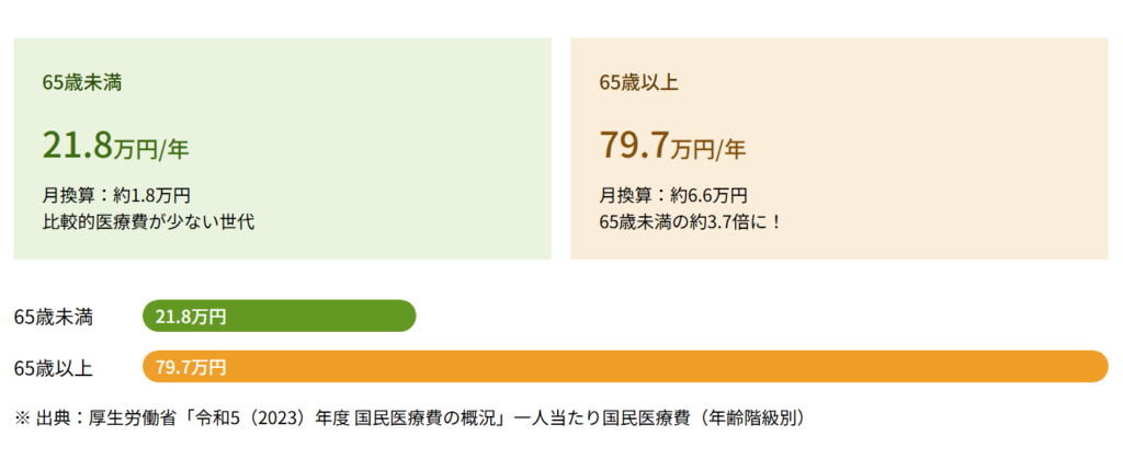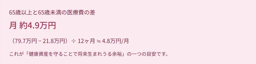 65歳以上になると医療費は一気に跳ね上がり、月6.6万円相当になります。年代別医療費の差は主に生活習慣病や慢性疾患によるもの。つまり、若いうちから健康資産を積み立てておくことが、将来の医療費を大きく左右するのです。
