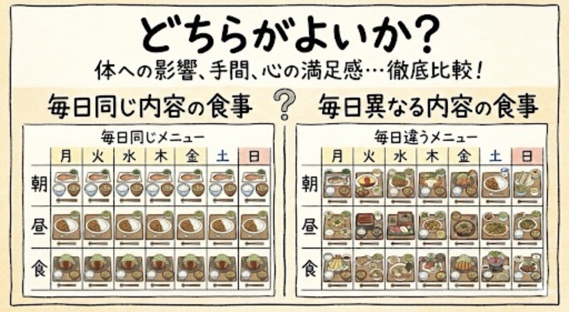 どちらがよい、悪いの区別はなく毎日同じ食事にも、毎日異なる食事にも、それぞれ一定のメリットがあります。